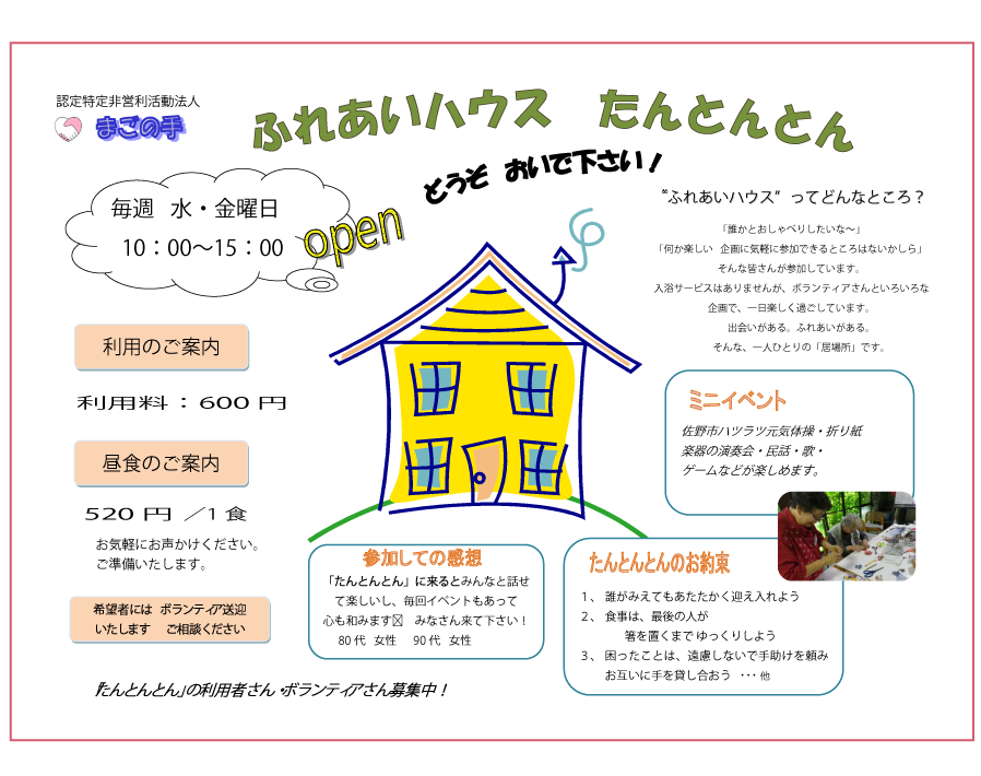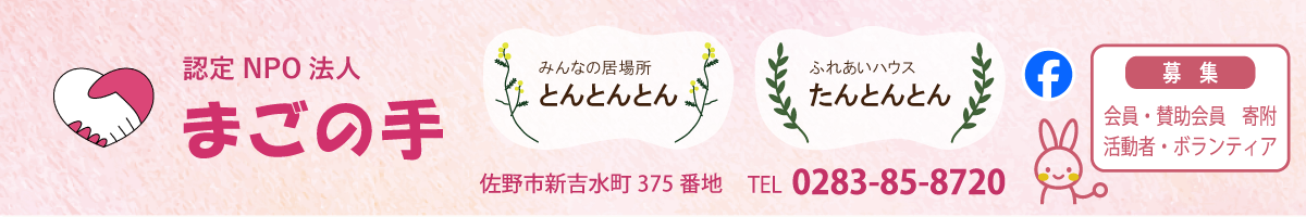 認定NPO法人 まごの手は、制度外の在宅福祉サービス、移送サービス、地域の居場所づくりの活動を通し、「自分らしく生きられる、生きがいが持てる、安心して暮らせる」地域福祉の充実を目的としています。